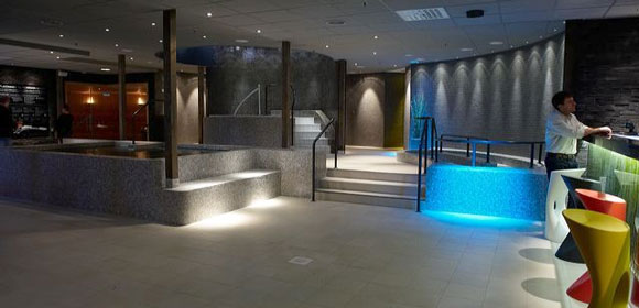 I Saunavärlden är kontrasten total. Här får du ro för sinne och själ. Flertal olika bastusorter, isvak, tropiskt regn och kneipp är några saker man kan testa på.